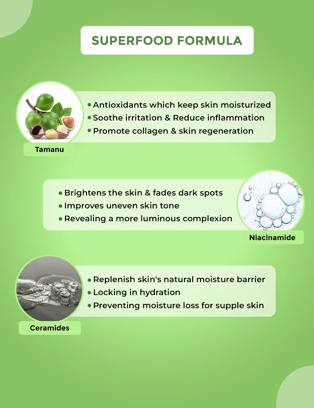 Purified Water, Niacinamide, Glycerin, Polyacrylamide & C13-14 Isoparaffin & Laureth – 7, Caprylic/ Capric Triglyceride, Ceramide NP, Magnolia Officinalis Bark Extract, DMDM Hydantoin (And) Methylchloroisothiazolinone (And) Methylisothiazolinone, Calophyllum Inophyllum (Tamanu) Seed Oil, Disodium EDTA