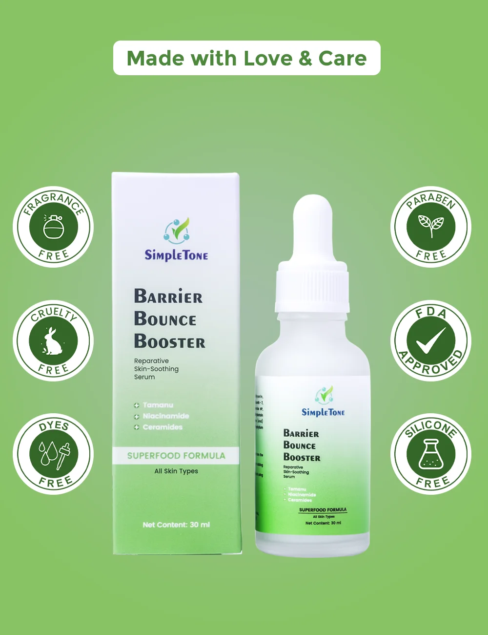 Discover the ultimate relief for sensitive skin with Barrier Bounce Booster Serum. Our rich, nourishing formula is crafted to calm irritation and heal a compromised skin barrier. Featuring a superfood blend of Tamanu, Niacinamide, and Ceramides, this serum hydrates, soothes, and strengthens without any greasiness. Ideal for revitalizing dry, red, and sensitive skin, especially after over-exfoliation or heavy retinol use. Experience the soothing and restorative power of Barrier Bounce Booster Serum today!